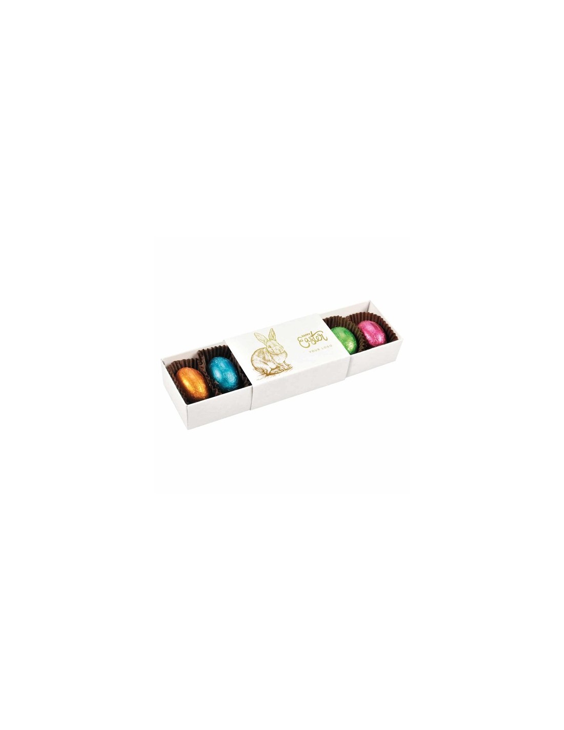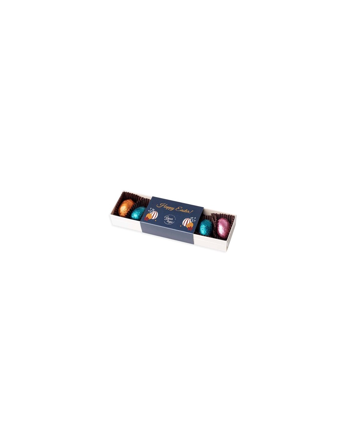 contenido : 7 huevos de chocolate relleno de nueces (total 84 g).Saboro : chocolate con leche.Opciones de producto : papel blanco o kraft.Inforomación adicional : color del papel: mezcla de colores, moldeado en R-PET (PET reciclado), papel blanco de serie, papel kraft elección opcional.Dimensiones : 55 x 190 x 30 mm.Cantidad Mínimo : 200 piezas.Fecha de caducidad mínima : 6 meses.