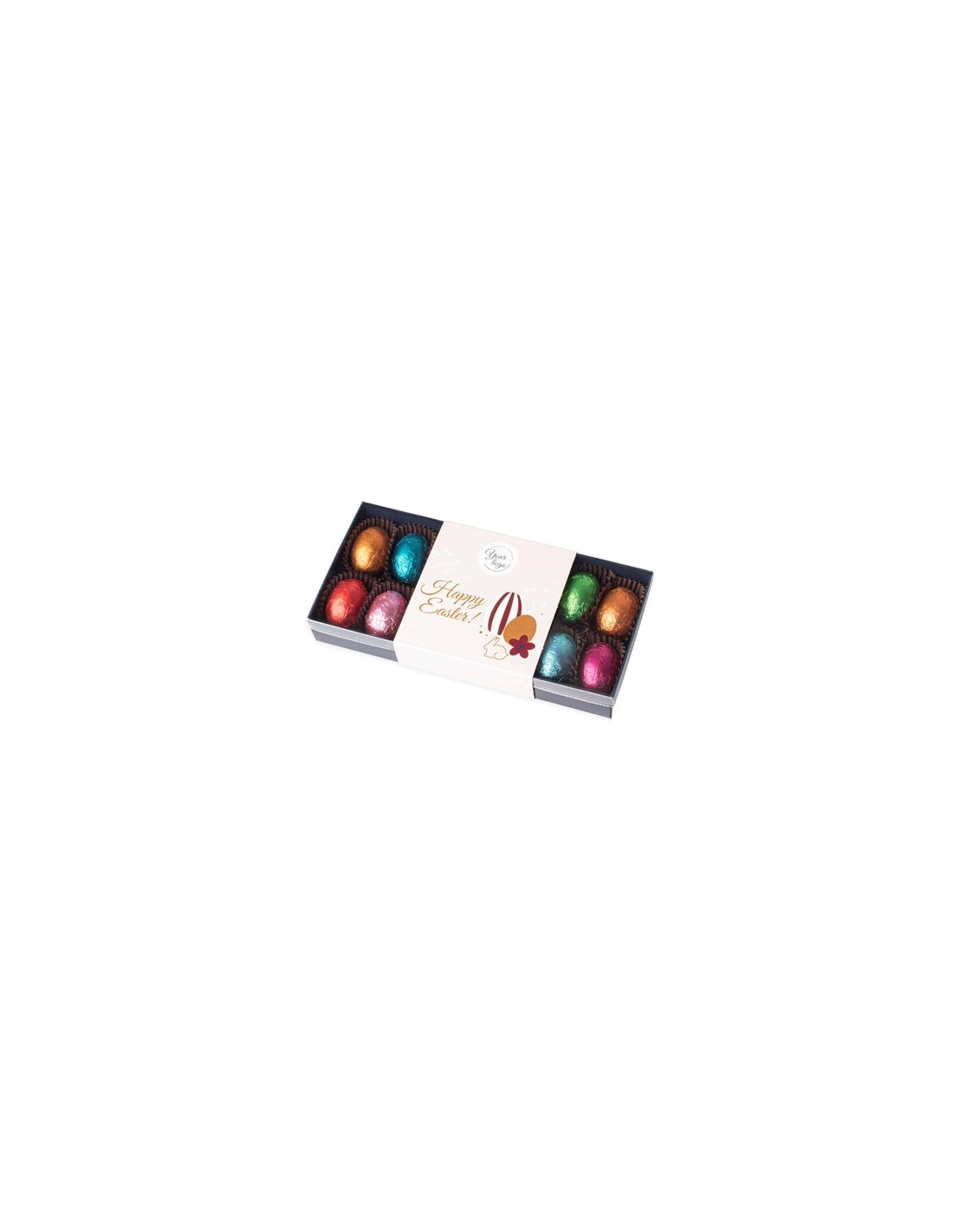 contenido : 14 huevos de chocolate relleno de nueces (total 168 g).Saboro : chocolate con leche.Opciones de producto : papel blanco o kraft.Inforomación adicional : color del papel: mezcla de colores, moldeado en R-PET (PET reciclado), papel blanco de serie, papel kraft elección opcional.Dimensiones : 90 x 190 x 30 mm.Cantidad Mínimo : 100 ejemplares.Fecha de caducidad mínima : 6 meses.