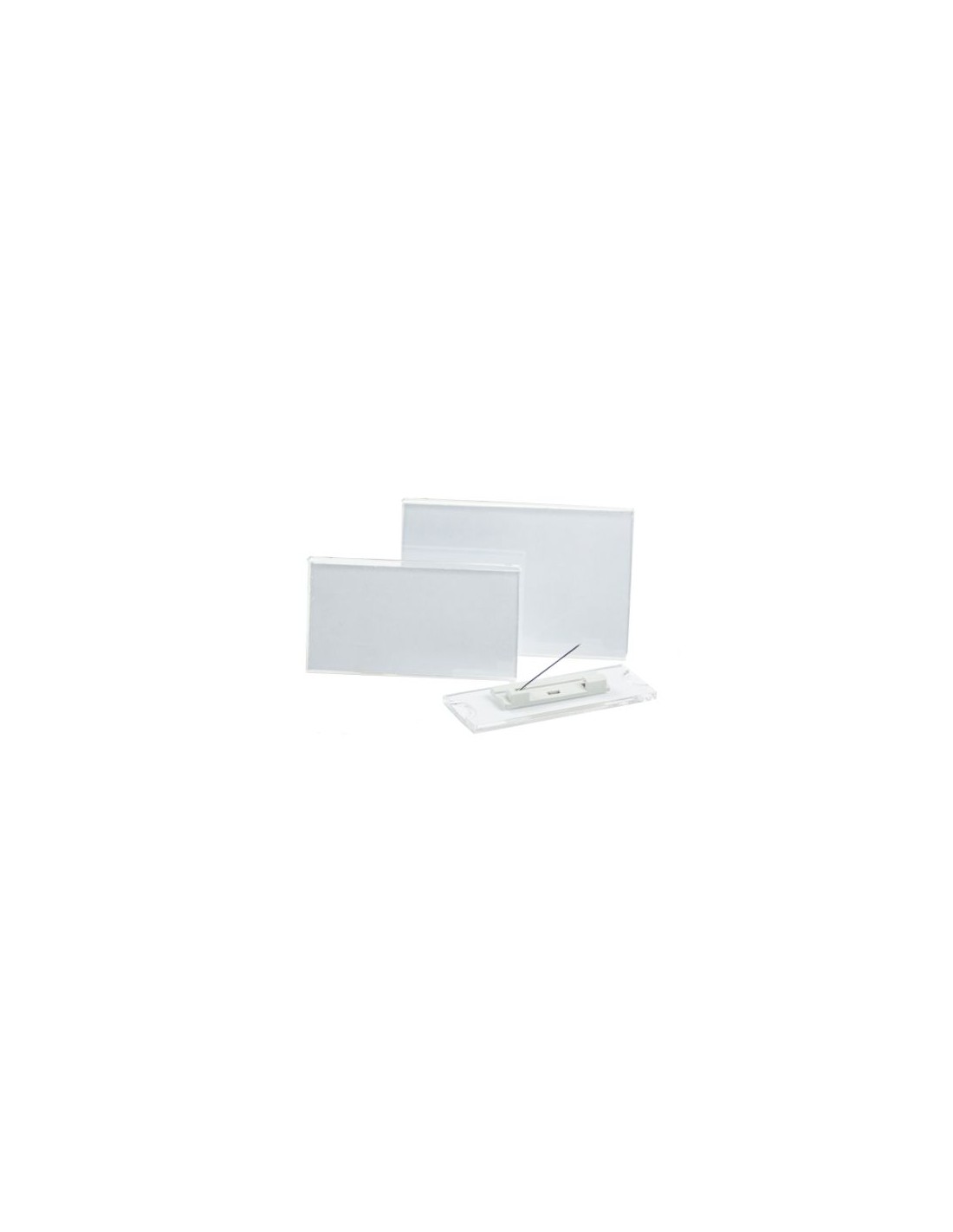 El identificador transparente, como su nombre indica, tiene una carcasa transparente donde se puede introducir cualquier tipo de tarjeta de visita. También puede personalizar el identificador con las tarjetas blancas que se incluyen en el paquete. Son tarjetas perforadas en una hoja A4. De esta manera podrá imprimir fácilmente su nombre logo o mensaje en las tarjetas. .