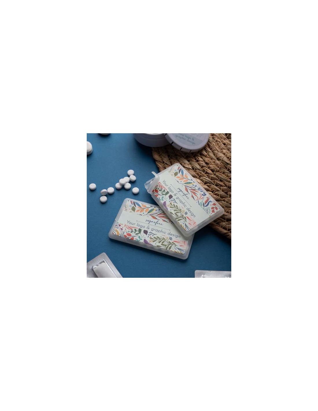 contenido : mini pastilles sin azúcar 8 g.Saboro : menta.Opciones de producto : colores des cartes: rojo, azul transparente, naranja transparente, verde transparente, jaune, jaune transparente.Inforomación adicional : TARJETA con un mini dosificador que permite una fácil distribución de las pastillas.Dimensiones : 78 x 48 mm.Cantidad Mínimo : 250 piezas.Fecha de caducidad mínima : 12 meses.