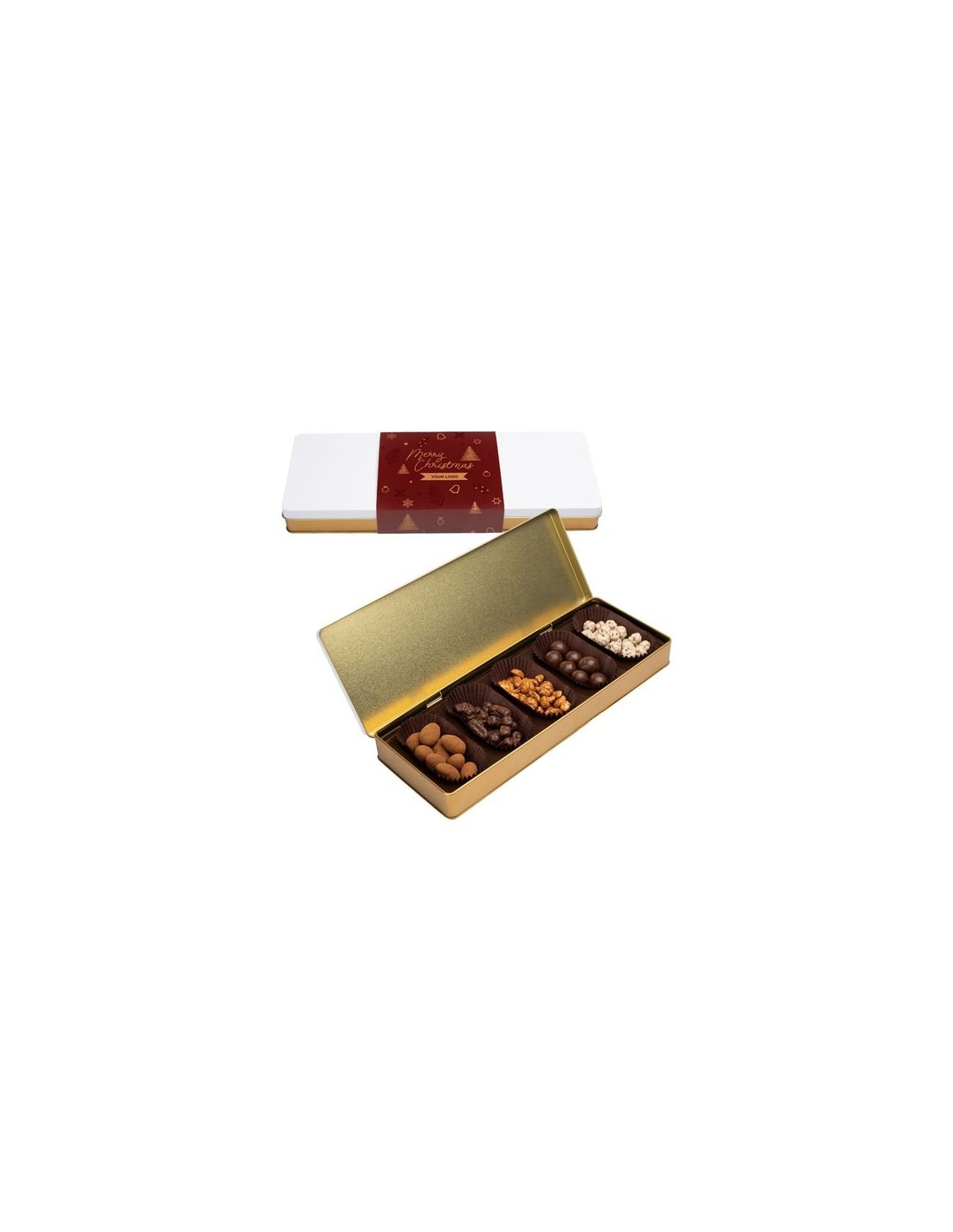 contenido : grosellas a maquereau de chocolate negro, grosellas de chocolate blanco, almendras de chocolatee con leche a la cannelle y écoroces de naranja de chocolate negro (160 g en total), un ensemble defrutas secs y nueces: cacahuyes de caramelo a la cannelleOpciones de producto : color de la caja: blanco-oro, etiqueta blanca, kraft o crudo con ajot de fibras de hierba, etiqueta o impresión directamente sobre la cajaInforomación adicional : caja metálica reutilizable según el principio de "residuo cero"., etiqueta en papel blanco de serie, papel kraft elección opcional, moldeado en R-PET (PET reciclado)Dimensiones : 300 x 110 x 35 mmCantidad Mínimo : 50 exFecha de caducidad mínima : 6 mesesTipo de impresión : directamente sobre la caja: digital, digital.