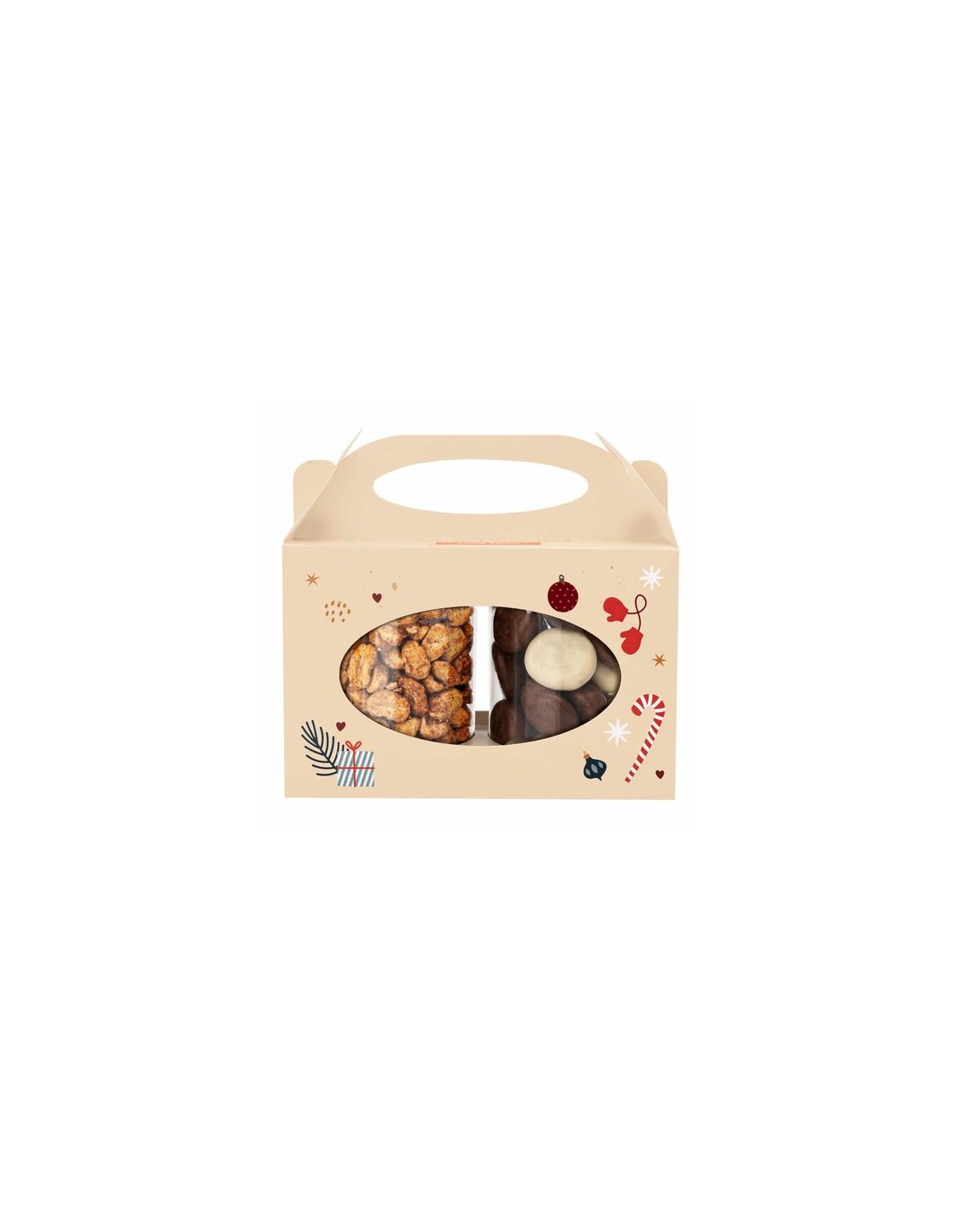 contenido : GALLETAS especiadas de chocolate blanco, de chocolate lait y de chocolate negro y cacahuyes de caramelo (145 g en total)Opciones de producto : papel blanco, papel kraft o papel crudo con ajot de fibras de hierbaInforomación adicional : papel blanco de serie, papel kraft o papel crudo con ajot de fibras de hierba elección opcionalDimensiones : 140 x 70 x 130 mm con poignyCantidad Mínimo : 50 exFecha de caducidad mínima : 6 mesesTipo de impresión : digital.
