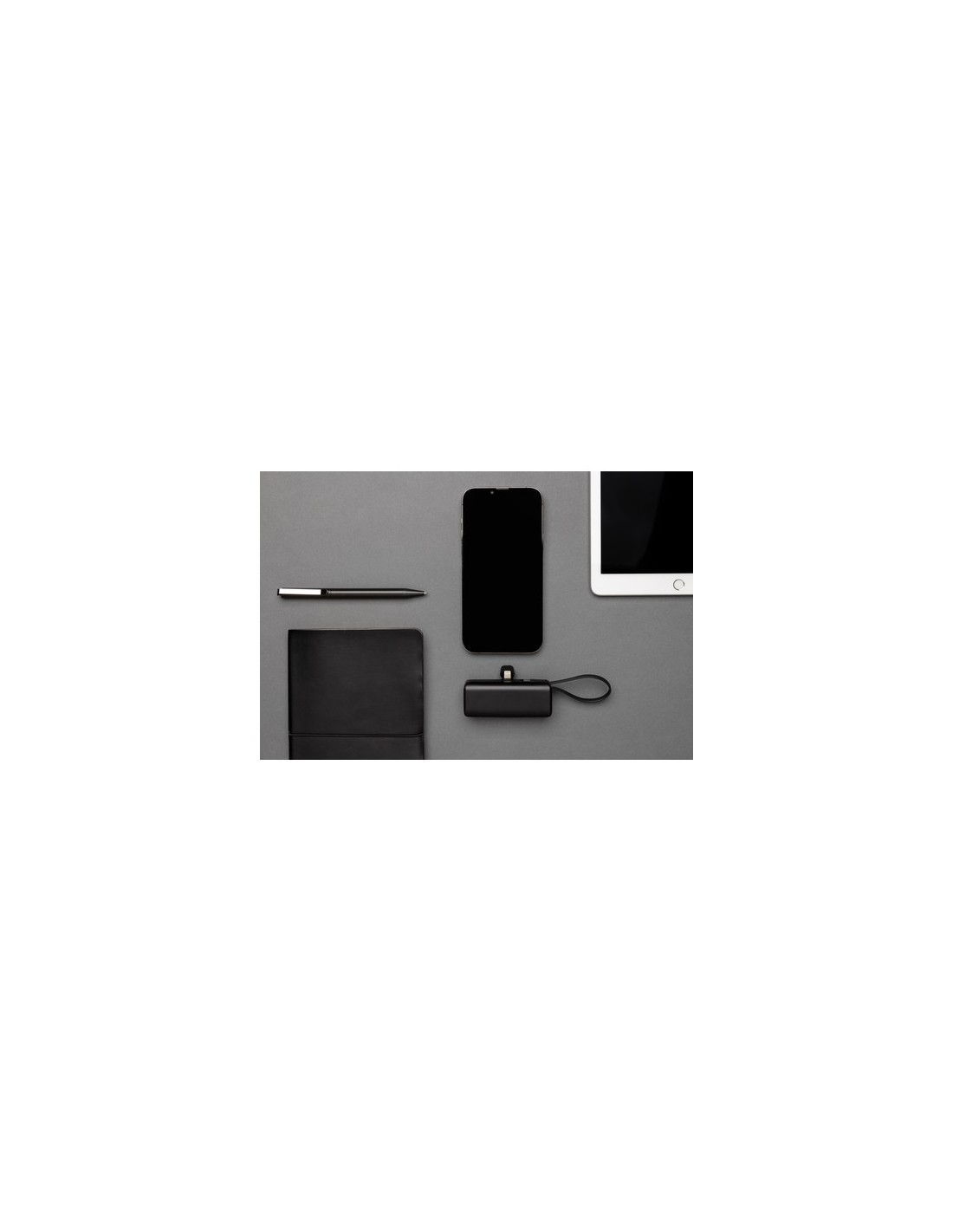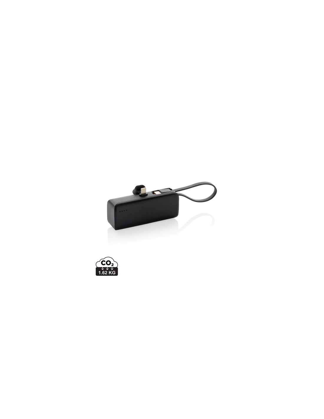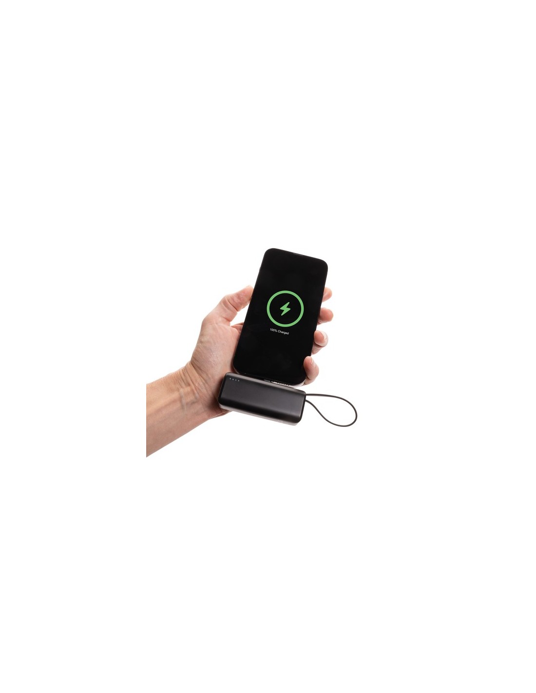 Powerbank portátil y de bolsillo fácil de llevar mientras viajas. El powerbank viene con un conector Lightning que puedes conectar fácilmente a tu iPhone para comenzar a cargar directamente. El powerbank de 3000 mAh también tiene un cable de entrada y salida USB C integrado que se puede usar para cargar elementos USB C y recargar el powerbank. No es necesario llevar ningún cable para usar o recargar este powerbank. Fabricado con ABS reciclado y TPE reciclado. Contenido reciclado total: 19% basado en el peso total del artículo. La certificación RCS garantiza una cadena de suministro de materiales reciclados completamente certificada. Presentado en embalaje FSC®. Sin PVC. Entrada: 5V/2.1A Salida 5V/2.4A. Material : ABS reciclado Recycled Content Percent : 19 Conforme directiva de sustancias peligrosas 2011/65/EC & 2015/863, Hoja de datos de seguridad del material disponible, Conforme PAHS content in Reach & ZEK 01-4-08, Conforme directiva Phtalate content, Conforme directiva Battery transportation safety UN38.3, Certificado para transporte aéreo, Conforme directiva seguridad baterias Alcalinas EN62133, Libre de parafinas cloradas de cadena corta y media., Conforme directiva EN60950-1 a la protección contra descargas eléctricas y peligros de energía, Conforme directiva Electromagnética 2014/30/EU WEEE Battery : 1 Li-ion - 21700 - 67 g. Packaging : Caja de regalo All print codes : Pad Print - Print code default : Tampografía - parte frontal del artículo - 70 x 15 mm - max color : 5 Social Audits : BSCI Total CO2 emissions : 1,62.