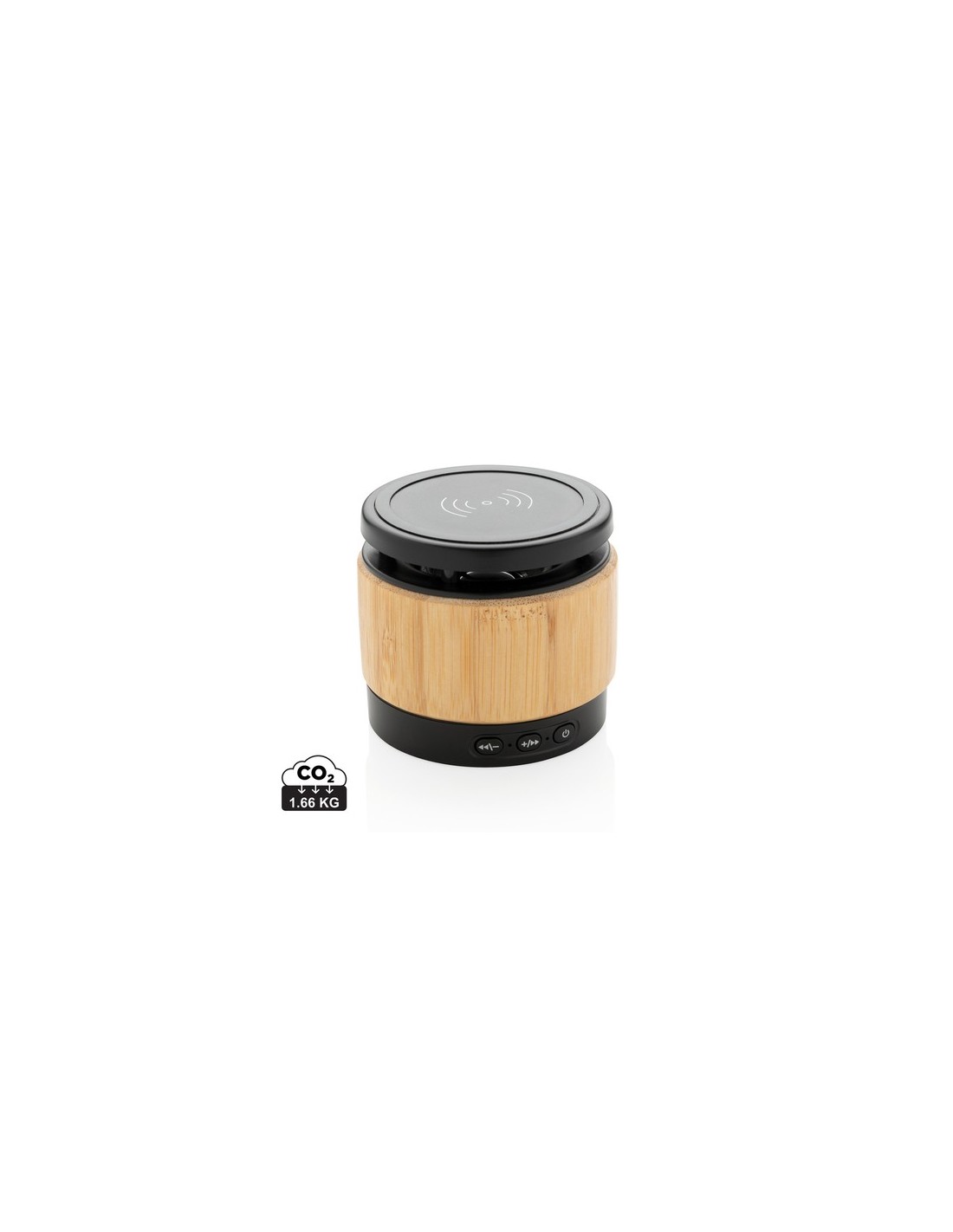 Este cargador de bambú ECO combina la escucha de tus canciones favoritas con la carga inalámbrica de su teléfono. Simplemente conecta el micro de 150 cm incluido a tu cargador USB en casa o en la oficina y estará listo para comenzar. Dispone de un altavoz inalámbrico de 3W y un cargador inalámbrico de 5W. El altavoz tiene una batería de 400 mAh y BT 4.2 que permite un tiempo de reproducción de hasta 3 horas y una distancia de funcionamiento de hasta 10 metros. Cuando utilices ambas funciones, asegúrate de que el artículo esté conectado a una fuente de alimentación. La carga inalámbrica es compatible con todos los dispositivos habilitados para QI, como la última generación de Android, iPhone 8 y superiores. Entrada: 5V/1A, Salida inalámbrica: 5V/1A 5W Material : Bambú, ABS Recycled Content Percent : 0 Libre de parafinas cloradas de cadena corta y media., Conforme directiva seguridad baterias Alcalinas EN62133, Certificado para transporte aéreo, Conforme directiva Battery transportation safety UN38.3, Conforme directiva SVHC 1907/2006/EC, Conforme PAHS content in Reach & ZEK 01-4-08, Hoja de datos de seguridad del material disponible, Conforme directiva de sustancias peligrosas 2011/65/EC & 2015/863, Conforme directiva equipamientos Radio y Telecomunicaciones 2014/53/EU, Conforme directiva bateria 2006/66EC WEEE Battery : 1 Li-poli - 10 g. Packaging : Bolsa de plástico y caja individual All print codes : CO2 Engraving 2,Pad Print - Print code default : Grabado CO2 - parte frontal del artículo - 25 x 25 mm - max color : 1 Total CO2 emissions : 1,66.