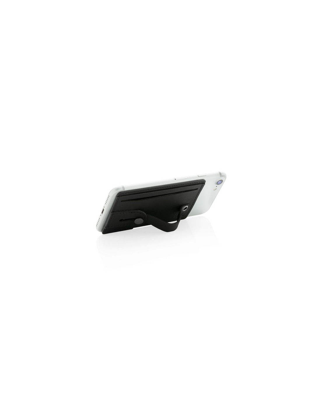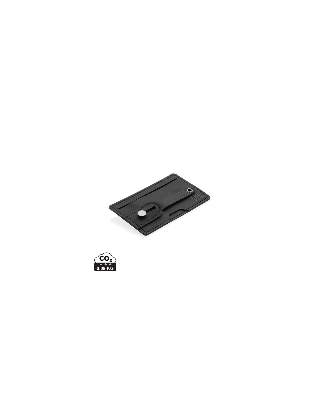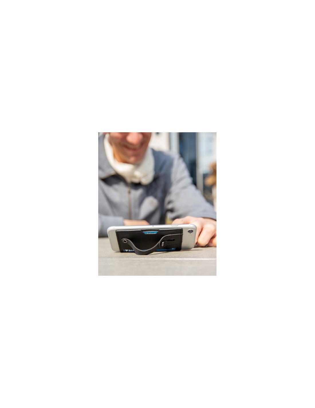 Cartera RFID de material PU que también se puede utilizar como soporte para teléfono. Este tarjetero RFID puede alojar hasta 2 tarjetas de crédito o tarjetas de identificación y las mantendrá protegidas contra exploraciones no autorizadas y actividades fraudulentas. La cinta adhesiva en la parte posterior te permite pegar el tarjetero a tu móvil con una superficie plana. El artículo tiene una correa que funciona como soporte y como stand. Material : PU Recycled Content Percent : 0 Conforme directiva SVHC 1907/2006/EC, Libre de parafinas cloradas de cadena corta y media., No usados materiales PVC, Conforme PAHS content in Reach & ZEK 01-4-08, Conforme directiva Cadmio 91/338/EC, Conforme contenido de plomo U.S Packaging : Polybag y a granel All print codes : Pad Print - Print code default : Tampografía - parte frontal del artículo - 45 x 10 mm - max color : 5 Social Audits : BSCI Total CO2 emissions : 0,09.