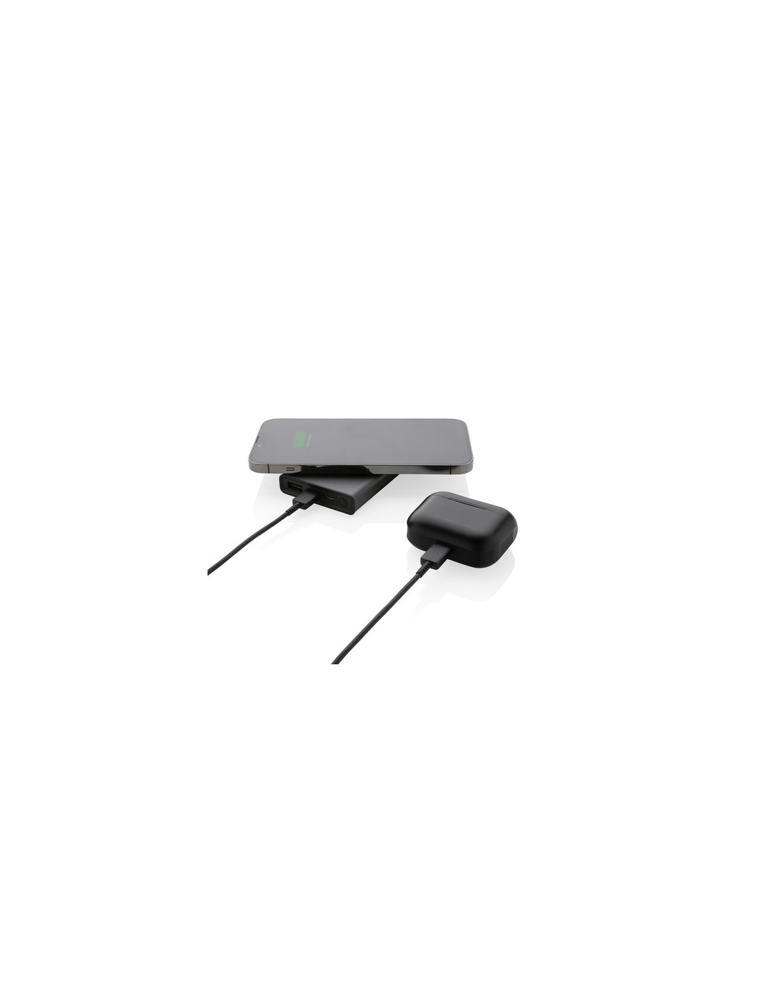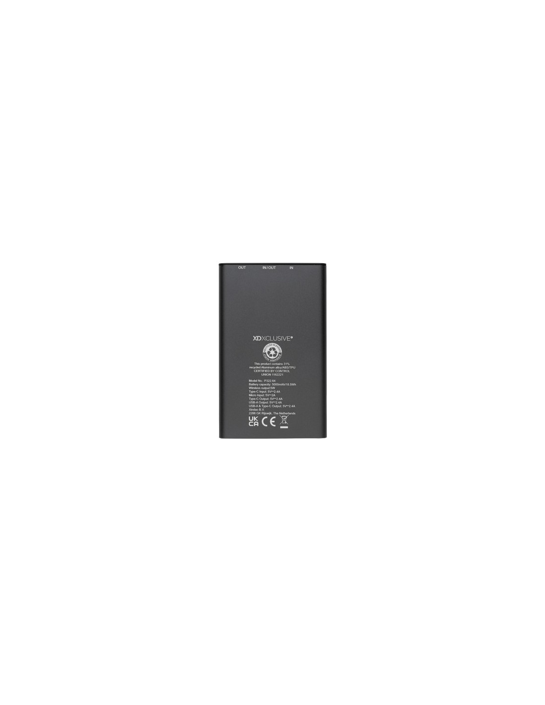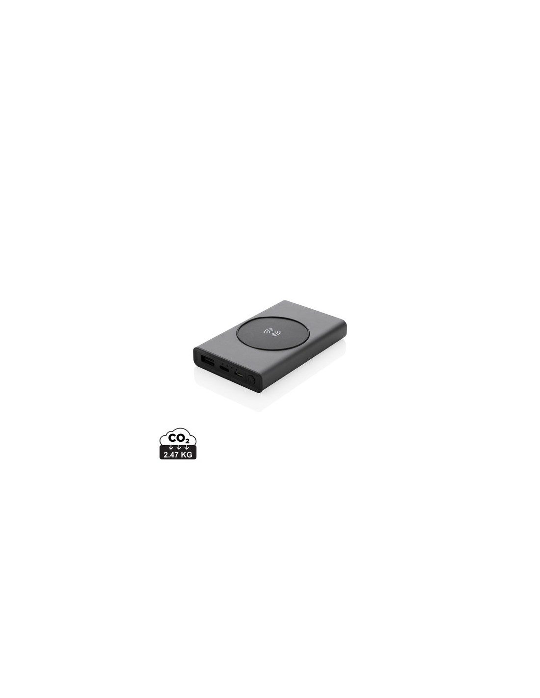 Powerbank fabricado con aluminio reciclado certificado RCS (Recycled Claim Standard) y ABS. Contenido reciclado total: 31% basado en el peso total del artículo. La certificación RCS garantiza una cadena de suministro completamente certificada de los materiales reciclados. El aluminio no pierde sus características en el proceso de reciclaje y puede reciclarse infinitamente. El powerbank contiene una batería de polímero de litio de 5000 mAh de grado A de larga duración. El cargador inalámbrico admite carga inalámbrica de hasta 5W. Los indicadores de energía indicarán el nivel de energía restante para que siempre sepas cuándo recargar. Artículo y accesorios 100% libres de PVC. Incluye cable de carga tipo C fabricado con aluminio reciclado certificado RCS, TPE y PET. Presentado en envase mixto FSC®. Salida USB 5/2.4A, Salida tipo C: 5V/2.4A. Entrada tipo C: 2.4A. Entrada micro USB: 5V/2A. Material : Aluminio reciclado, ABS reciclado Recycled Content Percent : 31 Conforme directiva equipamientos Radio y Telecomunicaciones 2014/53/EU, Conforme directiva de sustancias peligrosas 2011/65/EC & 2015/863, Hoja de datos de seguridad del material disponible, Conforme PAHS content in Reach & ZEK 01-4-08, Conforme directiva Phtalate content, Conforme directiva Battery transportation safety UN38.3, Certificado para transporte aéreo, Libre de parafinas cloradas de cadena corta y media., certificado de Recycled Claim Standard WEEE Battery : 1 Li-poli - 115570 - 90,5 g. Packaging : Caja de regalo All print codes : Laser Engraving 2,Pad Print - Print code default : Grabado a láser - parte frontal y baja del artículo - 45 x 15 mm - max color : 1 Social Audits : BSCI Total CO2 emissions : 2,47.